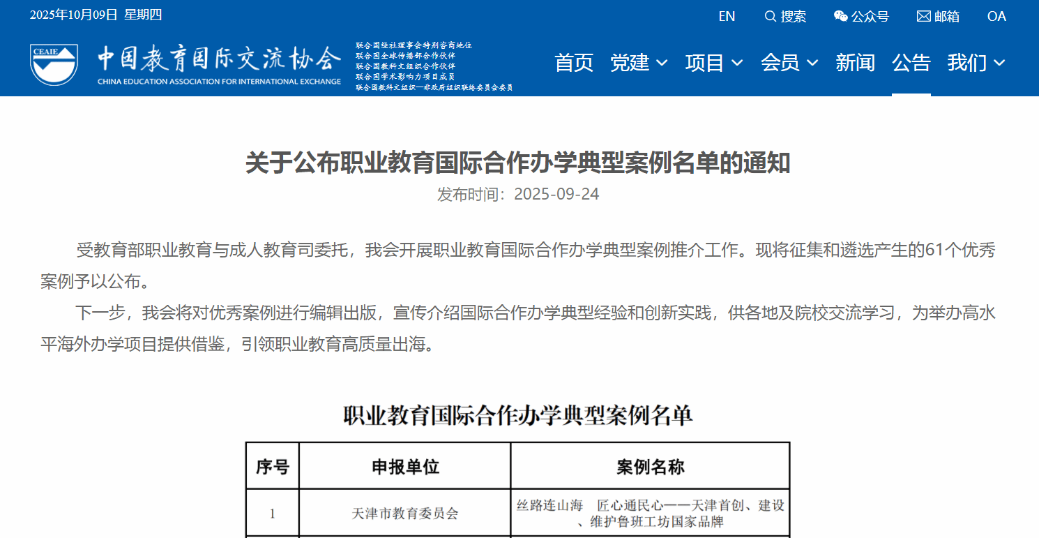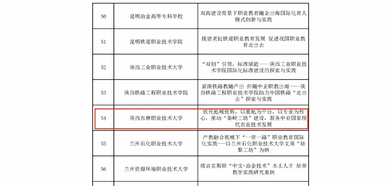 近日,教育部职成司委托中国教育国际交流协会开展的全国职业教育国际合作办学典型案例遴选结果公布,学校申报的《依托地域优势,以基地为平台,以专业为核心,推动“秦岭工坊”建设,服务中亚国家现代农业技术发展》案例成功入选。