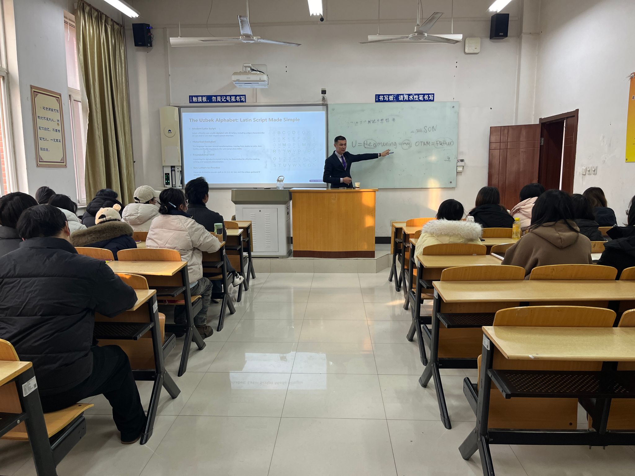 7天的访问活动中,我校聚焦现代农业、农业水利、人工智能机器人、信息工程、建筑工程等核心领域,为乌方代表团量身定制交流实践内容。乌方教师全程以饱满热情深度参与,与我校专家学者围绕专业技术、教学方法等内容开展多轮研讨,形成丰硕交流成果。同时,代表团成员走进旅游管理学院、生物工程学院,为我校学子带来系列专题授课,内容涵盖土壤包气带理化性质、乌兹别克斯坦地貌与土壤特征、国别文化及日常用语等,搭建起两国青年学子文化互鉴的桥梁。